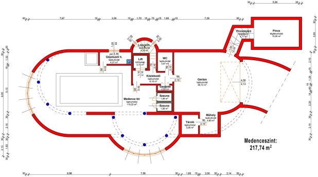 A kb. 217,74 m2 nettó alapterületű szuterénben: kétállásos garázs, borospince, vízforgatós,- homokszűrős,- fűthető,- ellenáramoltatós,- belső világítású medence, wellness – fittness, kazánház, WC, lift, lépcsőház, gardrób, 2 szauna, közlekedő, tároló, műhely található.