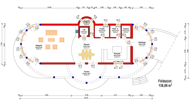 A kb.136,86 m2 földszinten: szélfogó, fürdőszoba, kamra,- konyha,- étkező,- nappali,- terasz, lépcsőház, lift, háztartási helyiség lett kialakítva. Az előbbi térmértéken felül található még a földszinten egy kb. 78 m2 alapterületű részben fedett terasz is.