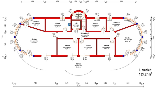 A ház alapterülete összesen a 4 szinten: 511 m2 + 129 m2 teraszok.