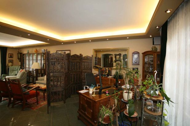 A nagyméretű nappali szoba egy részén, paravánfallal elkülönített dolgozósarok kapott helyet, a többi része a társasági élet tere. A nappali szoba működése egyszerű. A családi itt éli a társasági életét, a TV nézés, társalgás, olvasás befejeztével nyugovóra tér a család. Ekkor a kanapé fekhellyé alakítható és a nappali szoba átváltozik hálószoba funkcióvá.