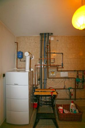 A hidegvíz hálózatról, a melegvíz a hőközpontból érkezik. A fűtés padlófűtés. A fűtést és a melegvizet a Vaillant Ecocompact kondenzációs hőközpont biztosítja. A gázkazán különösen magas hatásfokú és alacsony energiafogyasztású. Azonnal melegvíz folyik a csapból.